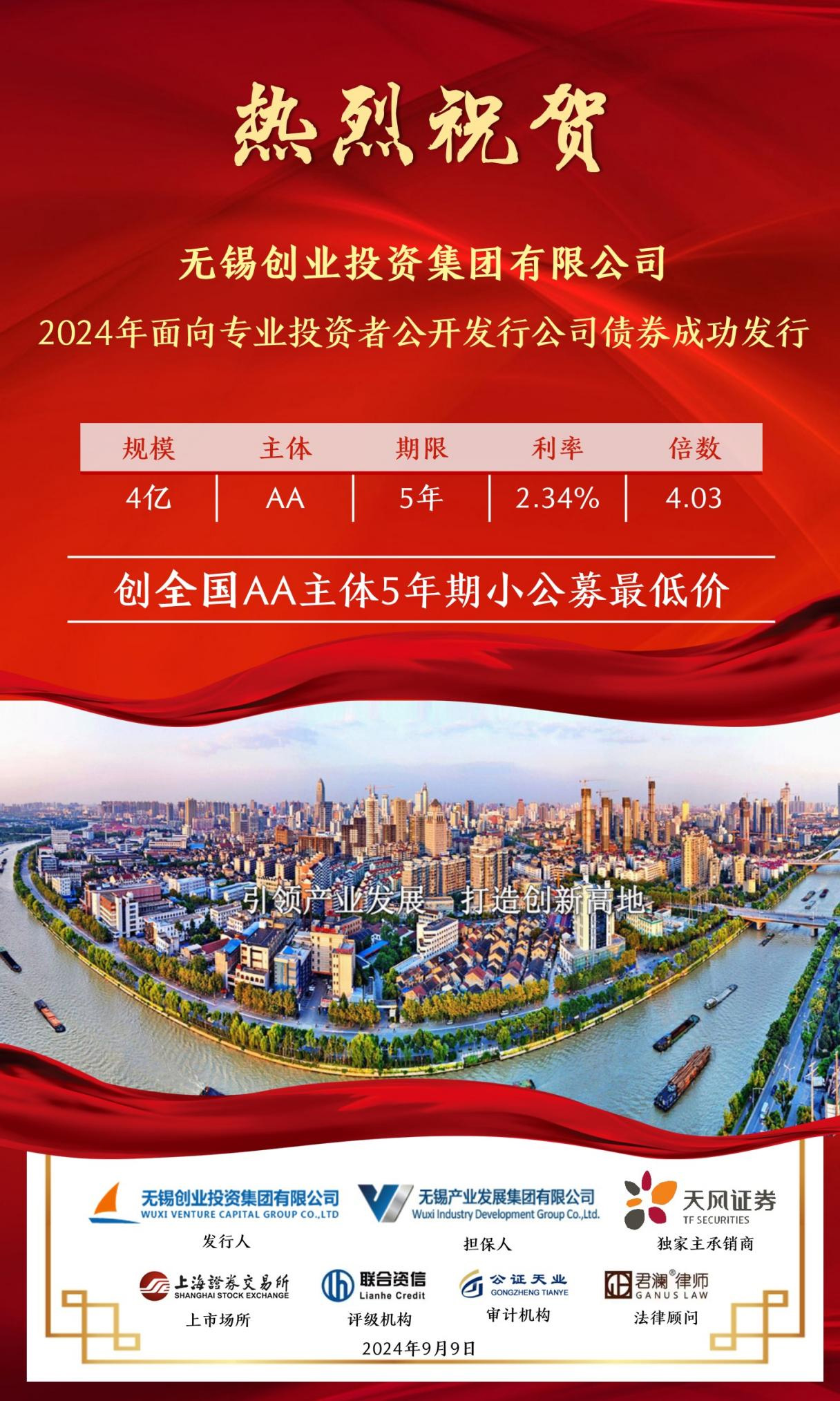 9月9日,無錫創(chuàng)業(yè)投資集團(tuán)有限公司(簡稱“無錫創(chuàng)投集團(tuán)”)2024年面向?qū)I(yè)投資者公開發(fā)行公司債券“24錫創(chuàng)01”成功發(fā)行,發(fā)行規(guī)模4億元,發(fā)行期限5年,認(rèn)購倍數(shù)4.03倍,票面利率2.34%,創(chuàng)全國可比債券歷史發(fā)行最低利率!本期債券由天風(fēng)證券承銷,主體評級AA,債項(xiàng)評級AAA。